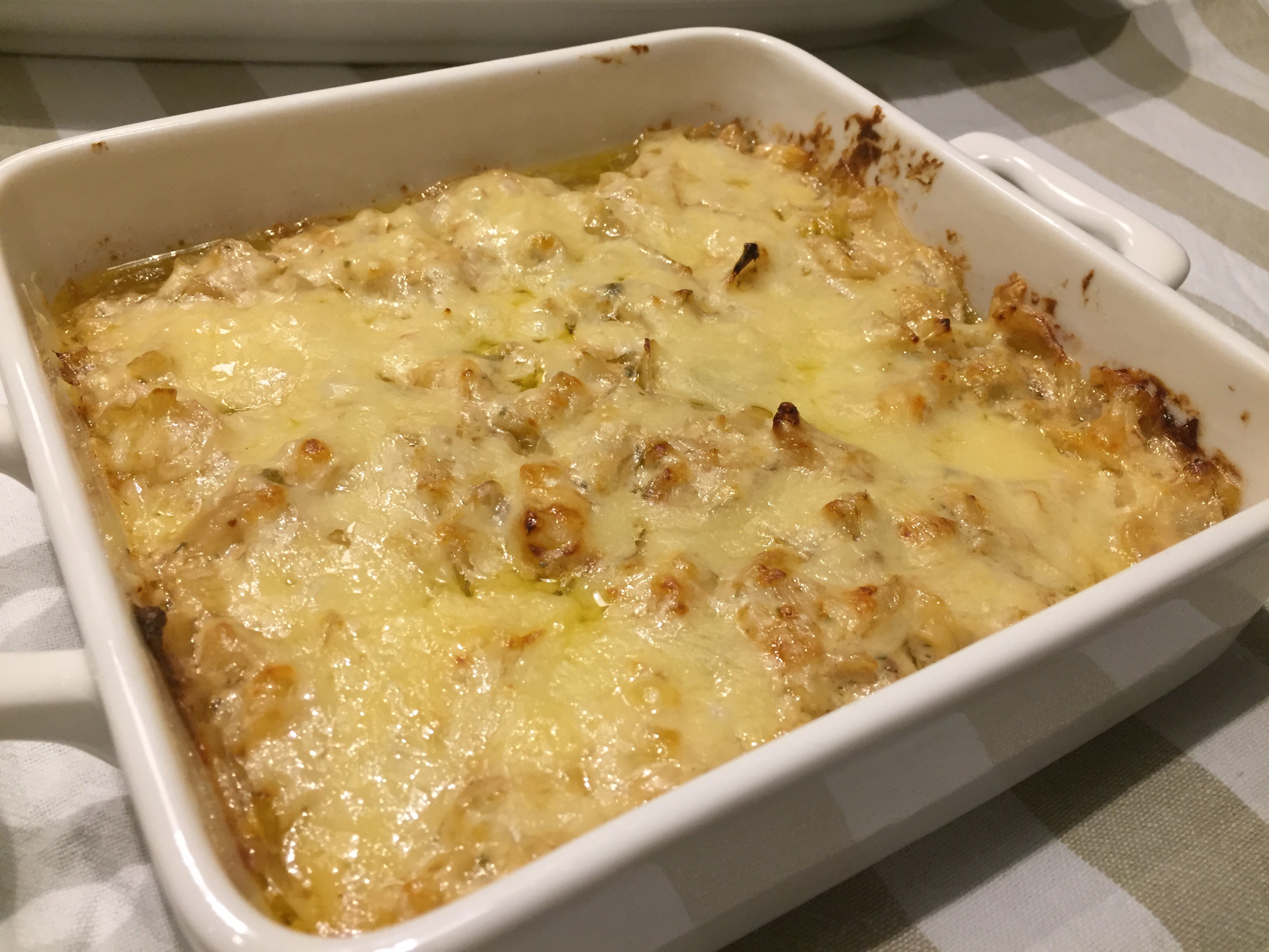 In i ugnen 200°C i ca 15 min för att osten ska få en gyllene färg och grädden får koka in.