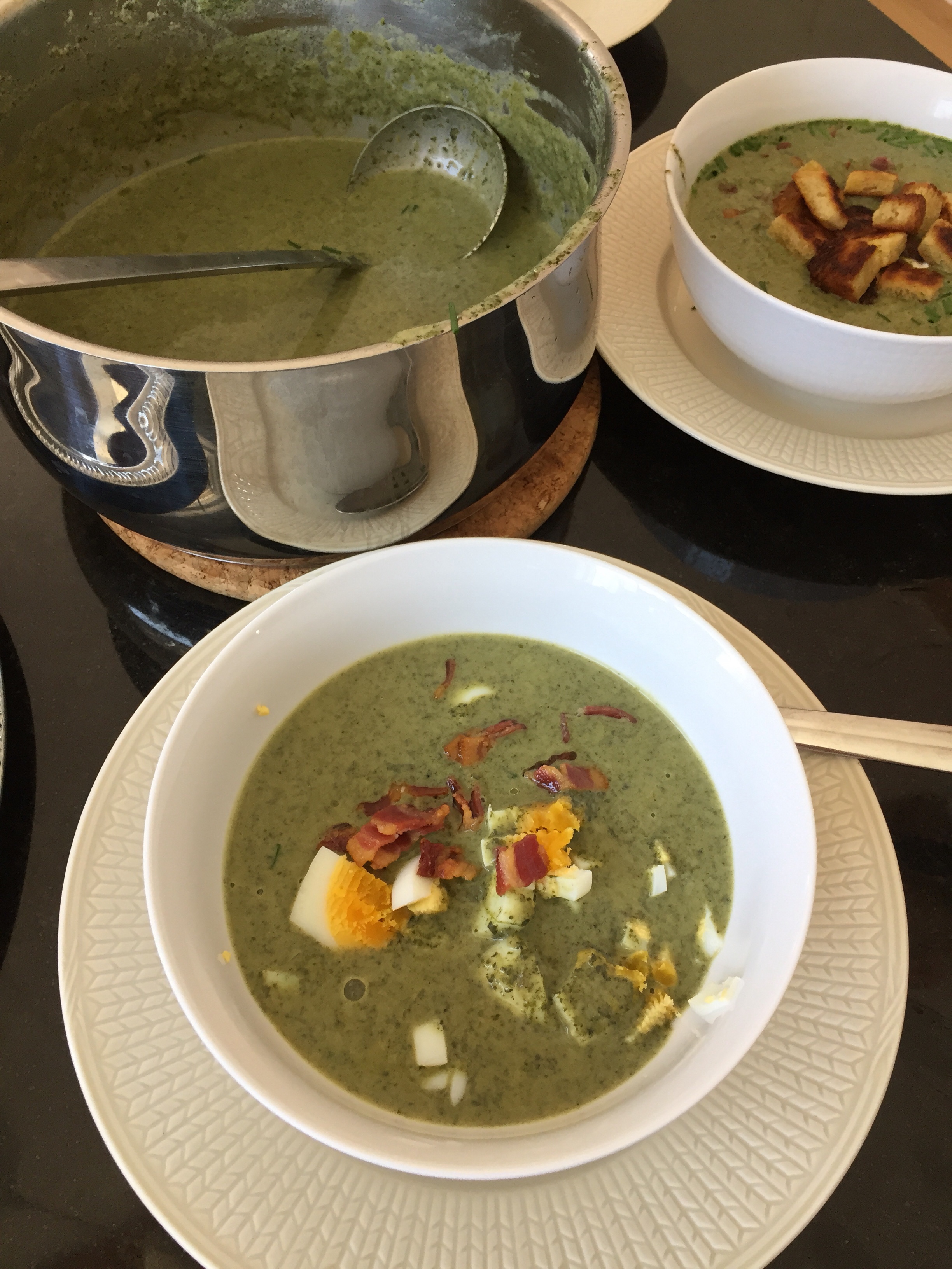 Ganska likt en spenatsoppa och man kan toppa den med vad man vill.